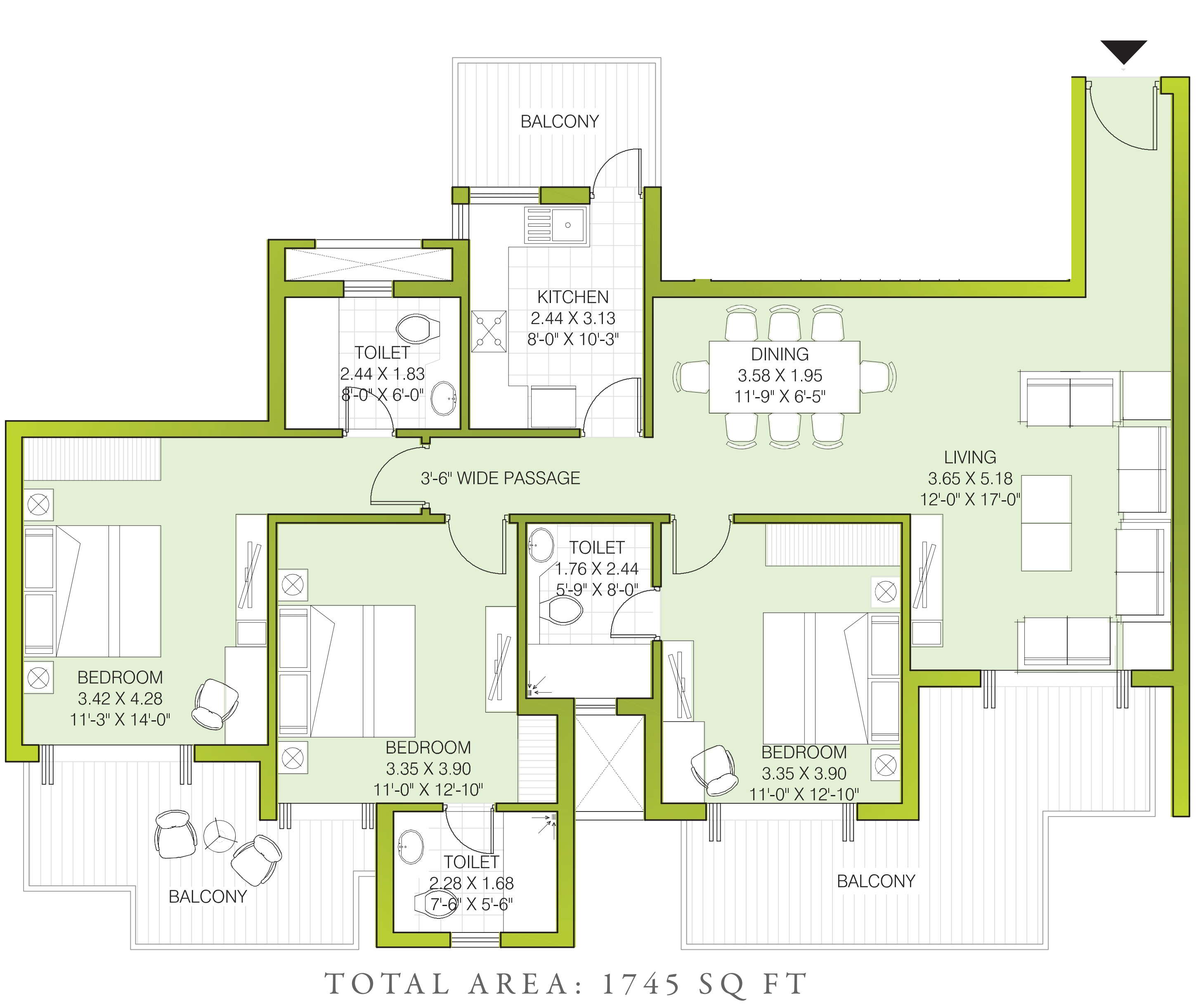 - Marble or vitrified tiles flooring in living, dining, bedrooms & lobby area