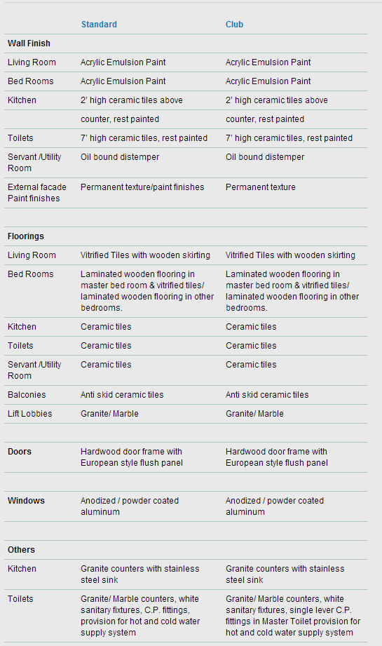 - To facilitate the Interior of the Living room, bedroom, kitchen, bathroom, balcony, high-quality materials are used only. Acrylic emulsion paint or oil bound distemper is used on the walls, Imported marble or vitrified Tiles are used for flooring, Hardware door frame with European style flush panel & anodized Acted aluminum is used for doors & windows.