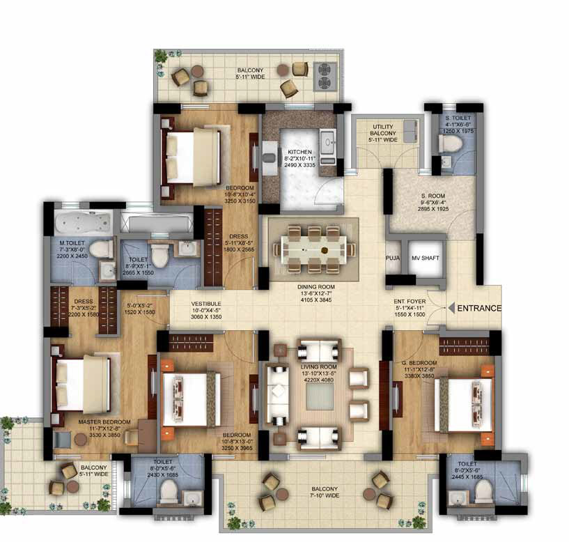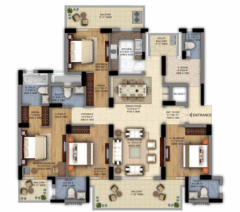 | 4 BHK + S Room | Tower A,B,D,F,G,H,L,M | |